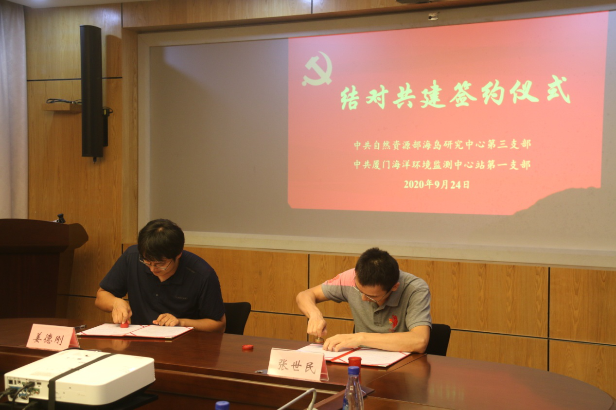 为更好地落实基层党支部党建工作主体责任,进一步促进党建和业务双融双促,9月24日下午,自然资源部海岛研究中心(以下简称海岛中心)第三党支部与国家海洋局厦门海洋环境监测中心站(以下简称厦门中心站)第一党支部举办了结对共建签约仪式。海岛中心纪委书记兼副主任苏晖和厦门中心站党委书记吴向荣出席签约仪式。