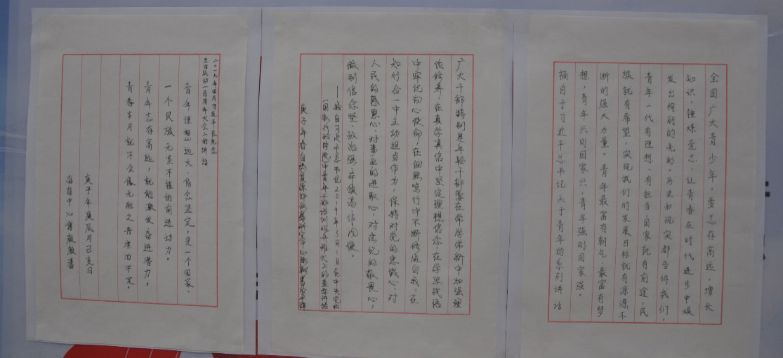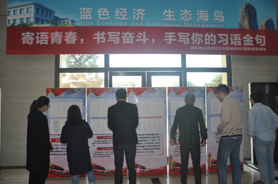 “五四”青年节前,海岛中心业务团支部主办了此次“寄语青春,书写奋斗,手写你的习语金句”活动,组织中心全体青年认真学习习近平总书记系列重要讲话,誊写对其影响最深或最受鼓舞的一句或一段金句。