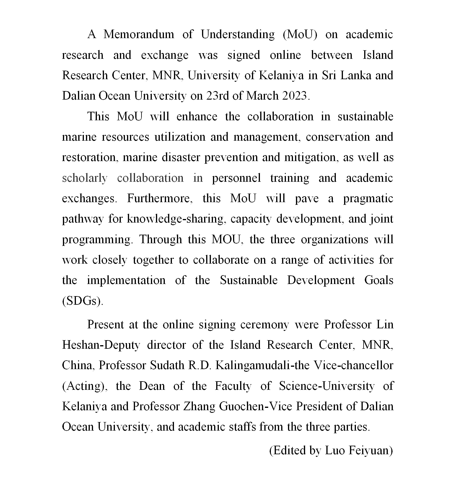 自然资源部海岛研究中心与斯里兰卡凯拉尼亚大学、大连海洋大学签署学术研究与交流谅解备忘录