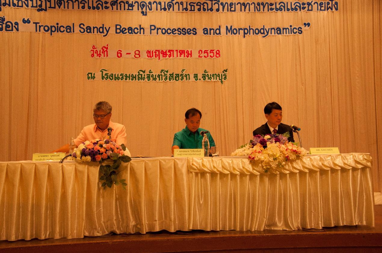 2015年5月6日上午9:30,在泰国Chanthaburi地区当地政府的组织下,国家海洋局海岛研究中心同国家海洋局第三海洋研究所与DMR(泰国自然资源与环境部矿产资源局)、DMCR(海洋与海岸资源局)以及当地政府对相关人员举行了“热带海滩过程和动力地貌”为主题的研讨会。中方代表海岛中心高文副主任,泰方代表DMR主任Dr. Tawsporn Nuchanong以及Chanthaburi副省长Mr.Sommai Wichianchan分别致欢迎词。