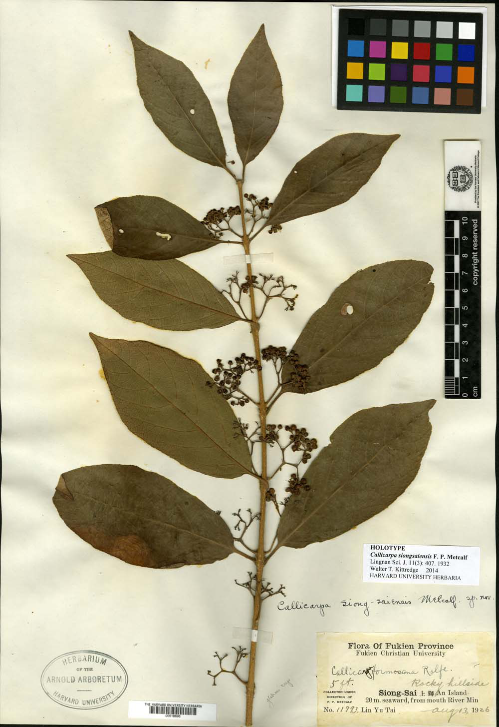 本期向大家推荐的是具有福建平潭特色的乡土植物——“上狮紫珠”,唇形科(原马鞭草科)紫珠属的一员,拉丁学名为Callicarpa siongsaiensis F. P. Metcalf。根据《中国植物志》的描述,上狮紫珠是在福建闽江口上狮岛发现,故以此岛命名。当年(1926年)采集的标本作为模式标本(模式标本是指在确定及发表某种生物学名时依据的典型标本)收藏在哈佛大学植物标本馆中。