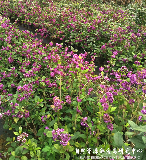上狮紫珠株型小巧,枝繁叶茂,冠型紧凑,树形小果量大,观果期长。目前,针对野生上狮紫珠的推广培育还不够,仅平潭综合实验区市政园林有限公司基于福建省科技厅区域发展项目“平潭海岛野生观赏植物种质资源及在海岛特色景观构建中的应用”,编撰了企业技术标准《上狮紫珠扦插培育技术标准》,并于去年在全国首次将上狮紫珠这一品种应用到市政绿化项目中,营造自然的海岛特色生态景观。