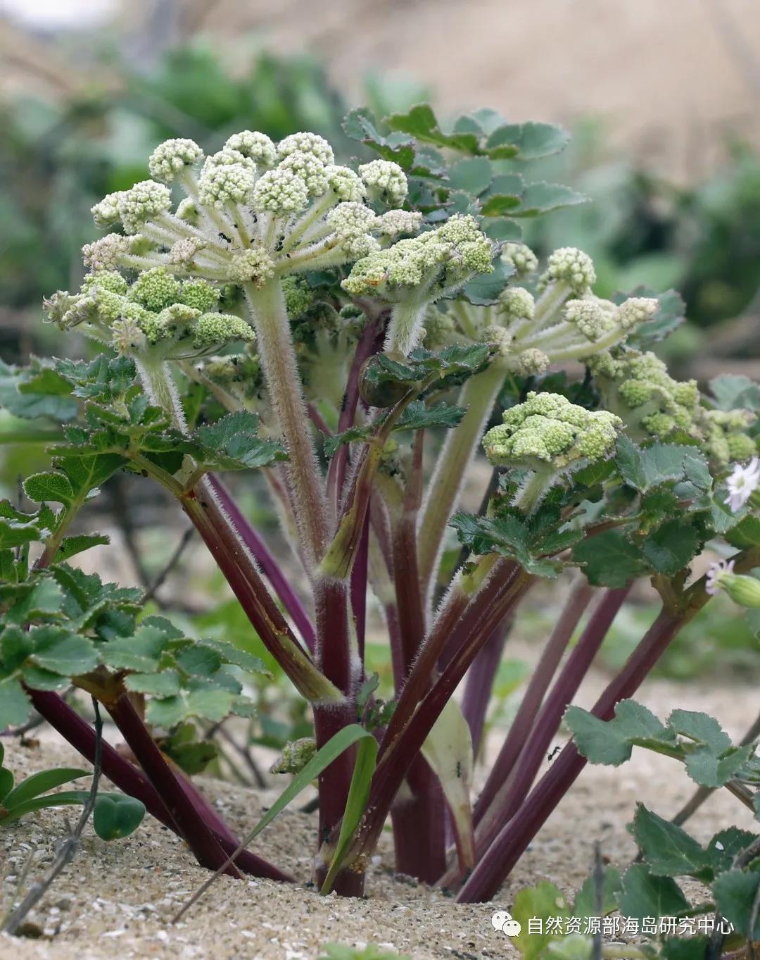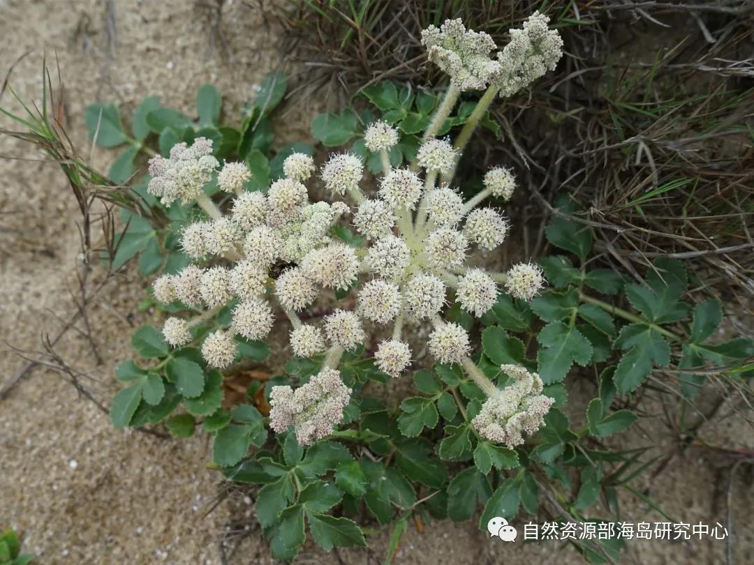 珊瑚菜,多年生草本,伞形科,珊瑚菜属,Glehnia littoralis Fr. Schmidt ex Miq,又名“北沙参”,其根入药,与人参、玄参、丹参、党参并称为五参,是一种很有发展前景的药食两用植物。目前以山东莱阳产的北沙参最为出名,除销往全国各地,也出口日本、韩国和东南亚等国家和地区。原本其野生生境北至辽宁,南至海南的沙滩上随处可见,但由于各种原因,一方面生境遭受破坏,另一方面老百姓无节制挖采或食用或入药,导致其近几年成了稀缺资源,因而被《国家重点保护野生植物名录(第一批)》定为国家二级重点保护植物,列入中国《国家二级保护植物名录》;列入《世界自然保护联盟濒危物种红色名录》(IUCN)——极危(CR)。