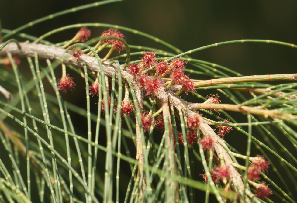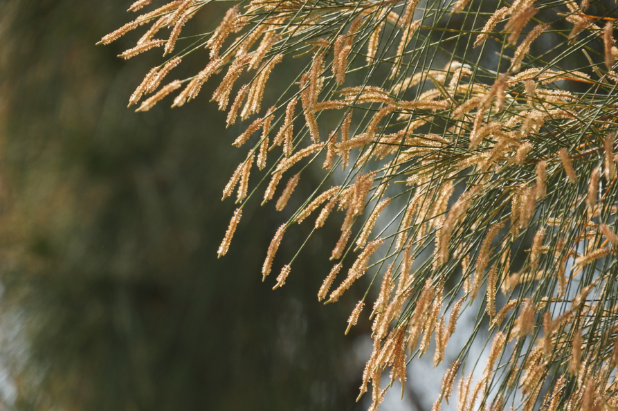 用“低调做树,高调做事”来形容木麻黄一点也不为过,大多时候人们觉得她长得很普通,普通到全身上下暗淡无光,开花时既没有出挑的颜色,也无硕大的花朵,时常有人误以为那一串串的花序,是树上掉下来的毛毛虫而惊慌失措。甚至还有不少人会把木麻黄当成马尾松,虽然她们都长着形似马尾的长辫子,但实际上并非一家人,前者是木麻黄科的,属于被子植物,后者是松科的,属于裸子植物。