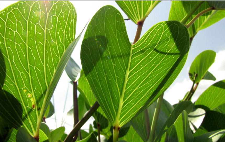 叶:革质或肉质,马鞍状,全缘,先端微缺或凹陷,基部截平至浅心形,长3.5~9厘米。