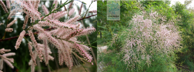 柽柳属植物通常为灌木或乔木,多分枝,幼枝无毛;枝条有两种;一种是木质化的生长枝,经冬不落,一种是绿色营养小枝,冬天脱落。花小粉红色,种子被白色柔毛,每年可开花1-3次,集中在4-9月。