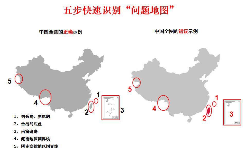 我们说的“问题地图”主要指存在危害国家主权统一、领土完整、安全和利益等严重问题的地图,“问题地图”的常见错误有漏绘钓鱼岛、赤尾屿、南海诸岛等重要岛屿,错误表示台湾省、错绘藏南地区和阿克赛钦地区国界线等。