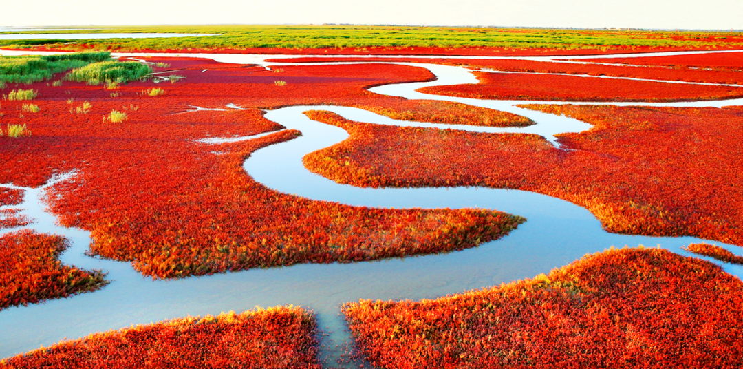 现代诗人李者也口中赞美红海滩的诗句,正是辽宁辽河口国际重要湿地的真实写照。辽宁辽河口国际重要湿地绵延百里的滨海滩涂,生长有茂密的翅碱蓬单一群落,构成了保护区湿地生态类型中独特又著名的“红海滩”景观。