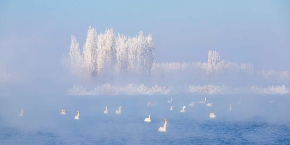 正如笔名为“羌溪河畔”的现代诗人在《浣溪沙·伊犁天鹅泉写照》一诗中所言,新疆伊犁天鹅泉湿地因为水下有多处温泉,冬季水面不结冰,成为疣鼻天鹅的越冬地。这里如童话般的天鹅、雾凇景观,令无数游人倾倒。
