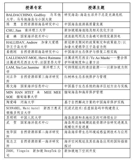 培训班拟围绕海岛海岸带保护管理与生态修复实践、海洋空间规划与清洁能源开发利用、海岛经济与可持续发展等进行线上授课,辅以专题讨论。授课专家和主讲内容具体如下: