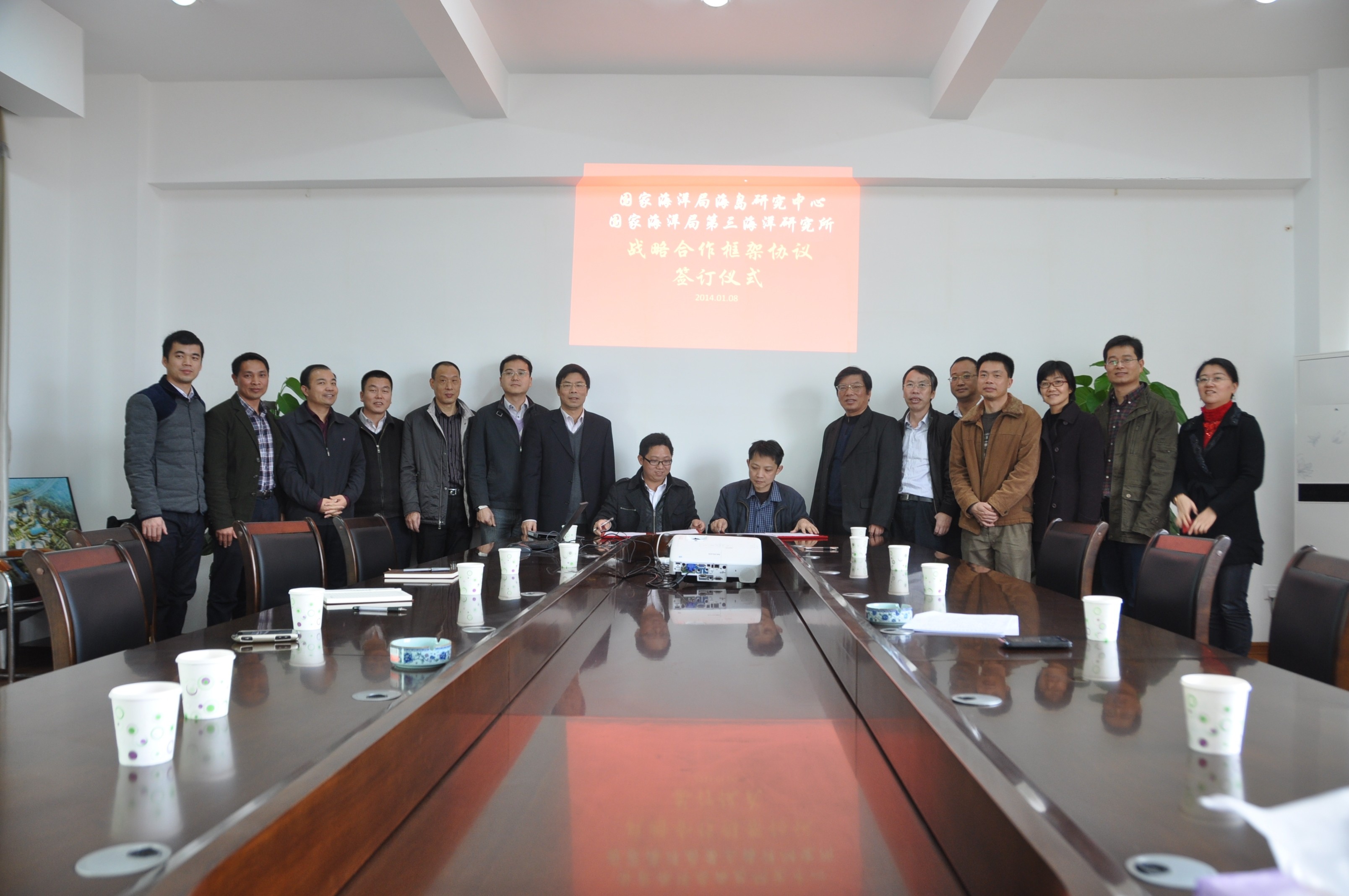 为推动国家海洋、海岛事业的发展,共同建立长期、稳定的战略合作关系,2014年1月8日,国家海洋局第三海洋研究所所长余兴光率队莅临国家海洋局海岛研究中心,与我中心签订了战略合作框架协议。签订仪式由国家海洋局海岛研究中心主任蔡锋主持,海洋三所部分中层干部及海岛中心全体中层干部共同参加。会上,双方就自身的人才、技术、设备、实验条件及相关资质优势等方面进行了密切交流,并本着“平等互利、优势互补、密切合作、共同发展”的原则下,在海岛规划与保护、海岛生态环境整治修复、海岛基础调查、海滩管理与养护技术、海岸海底地形地貌调查、海洋文化等重点领域开展合作研究。协议签订后,双方成立联络小组,海岛中心由海岛开发处负责,海洋三所由技术开发处负责,联络小组承担合作过程中的组织协调工作。