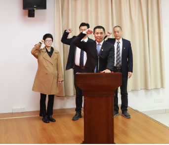 宣誓仪式由中心领导张海峰、李瑞山、丰爱平监誓。领誓人林河山处长左手抚按宪法,右手举拳,领诵誓词,中心新任职中层干部共同跟诵誓词,面向国旗做出庄严承诺。