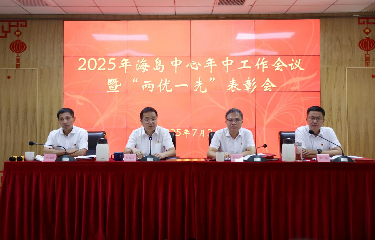 7月2日,海岛中心召开2025年年中工作会议暨“两优一先”表彰会。中心主任、党委书记张海峰作年中工作报告,对上半年工作进行总结,并对下半年工作进行部署;中心副主任林河山宣读2024-2025年度“两优一先”表彰决定;会议由中心党委副书记、纪委书记洪再展主持,中心全体干部职工及工作专班成员参加。