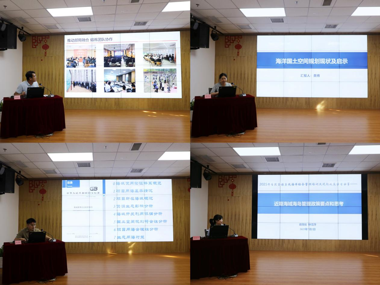 党课结束后,还举办了“岛屿讲堂”专题讲座活动。姜德刚以《建设项目自然资源要素保障协同机制调研》为题,深入剖析了当前建设项目中自然资源要素保障的协同机制,分享了在实际调研中的经验与思考,为优化资源配置、提升项目推进效率提供了理论与实践相结合的见解。黄博以《海洋国土空间规划现状及启示》为题,从宏观角度阐述了我国国土空间规划体系,并结合国际合作工作实际,深入探讨了国际空间规划对国际合作的启示,进一步拓宽了干部职工在国际合作领域的视野和思路。吴思楷带来的《海域使用论证技术培训分享》,详细介绍了海域使用论证技术的关键要点和最新进展,分享了自己在实际工作中的宝贵经验和案例分析,为提升中心海域使用论证工作的质量和效率提供了切实可行的经验借鉴。林雪萍围绕《近期海域海岛管理政策要点和思考》展开分享,对近期海域海岛管理的政策要点进行了系统梳理和深度剖析,交流了自己对于政策执行和未来发展方向的思考,为干部职工在实际工作中准确把握政策、依法依规开展管理工作提供了重要指导。