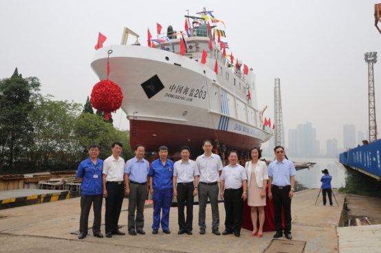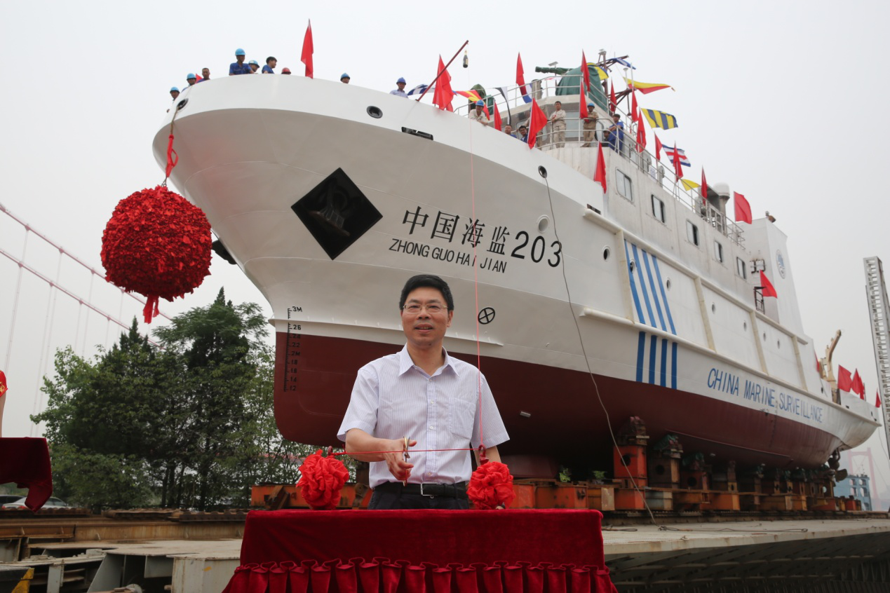 6月26日,国家海洋局海岛研究中心“中国海监203”船在武汉下水,国家海洋局政策法制与岛屿权益司王胜强处长、中国海监东海总队邹彬副总队长、国家海洋环境监测中心王菊英副主任、国家海洋局第三海洋研究所吴日升书记、国家海洋技术中心(国家海洋调查船队技术组)李守宏工程师,我中心蔡锋主任、侯纯扬书记、苏晖副主任、高文顾问,中船重工第七〇一研究所李德智副处长、武船重工集团有限公司陈埥总经理等出席下水仪式,活动由武船重工集团有限公司汪渭龄副总经理主持。