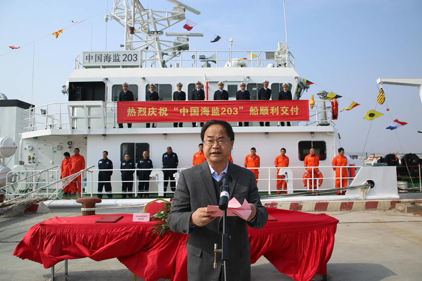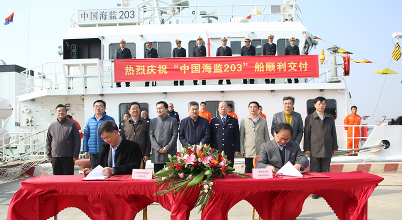 国家海洋局海岛研究中心侯纯扬书记与武昌船舶重工集团有限公司王渭龄副总经理分别致辞并签订了交接船议定书。侯书记对国家海洋局、地方政府相关部门,船舶设计、建造、监理单位及现场监造组和一线生产工人们表达了诚挚的谢意,他强调“中国海监203”船对海岛中心未来开展海岛科研业务,提升海岛海洋监视监测能力,推动国家海岛事业长足发展的重要性。
