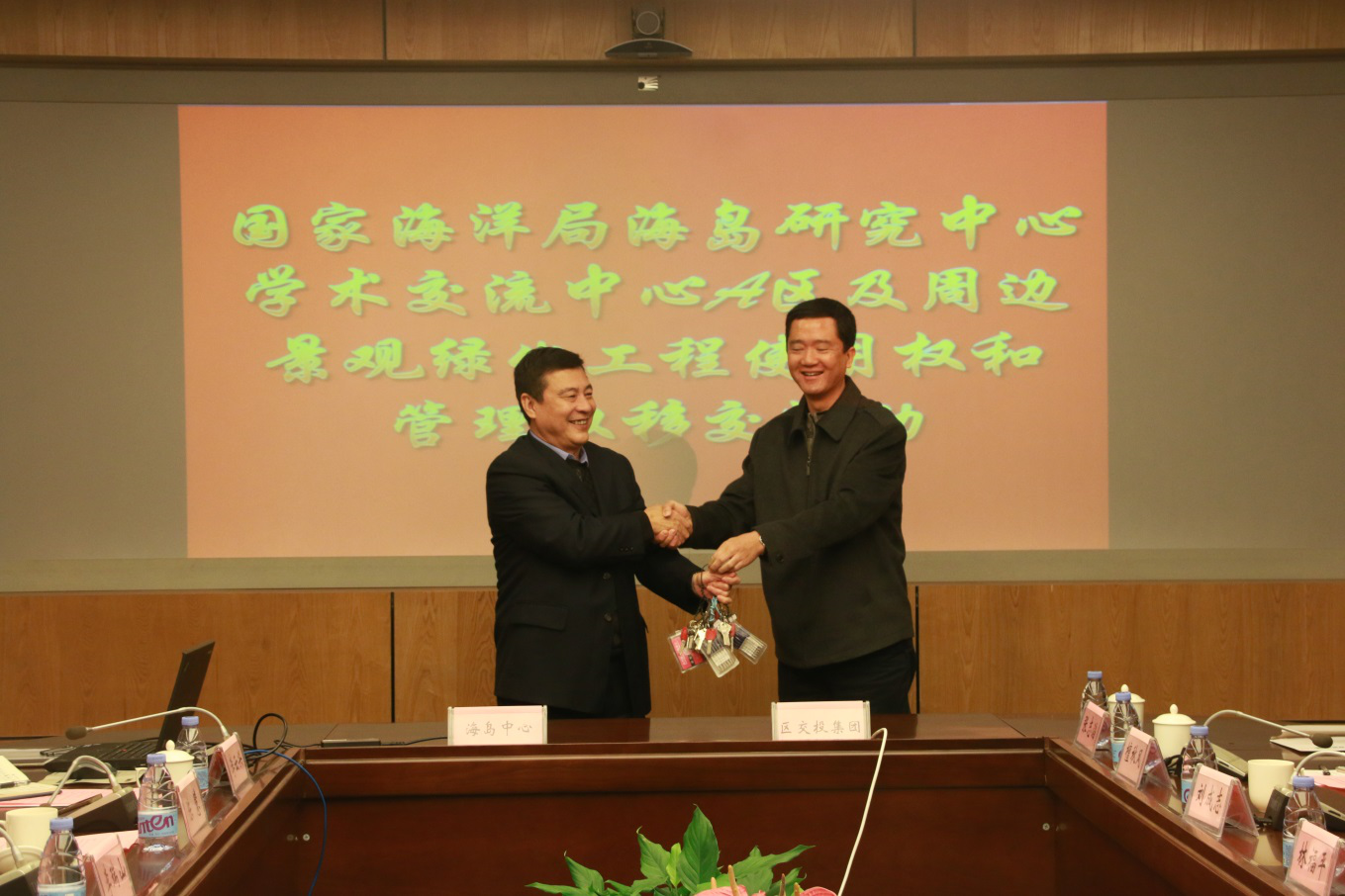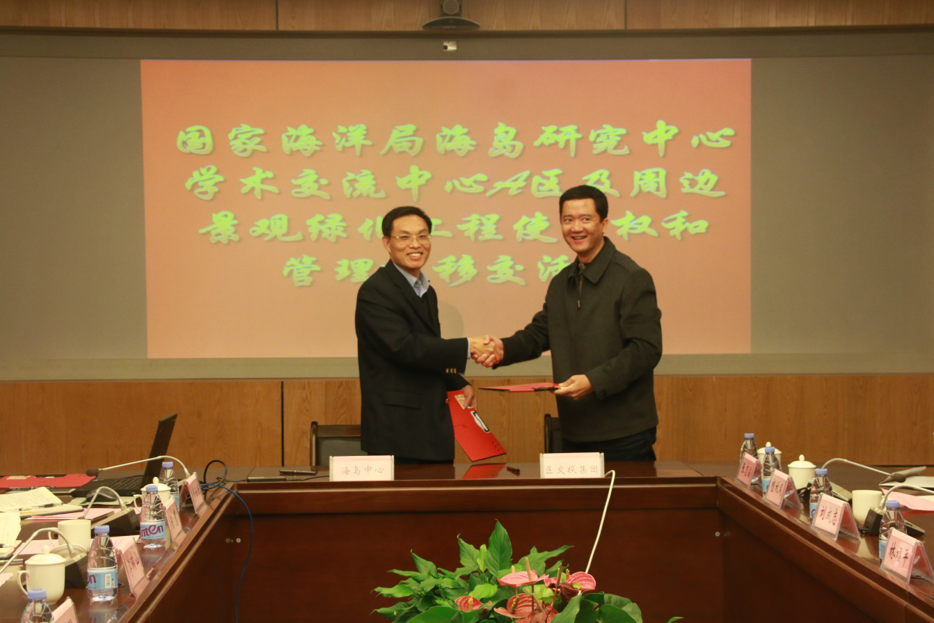 在移交活动现场,海岛中心副主任苏晖分别与区交投集团副总林东明、区林业局副局长林福平签订《国家海洋局海岛研究中心学术交流中心A区移交使用协议》、《国家海洋局海岛研究中心学术交流中心A区周边景观绿化工程移交使用协议》,中心副主任李瑞山与区交投集团副总林东明交接大楼钥匙。