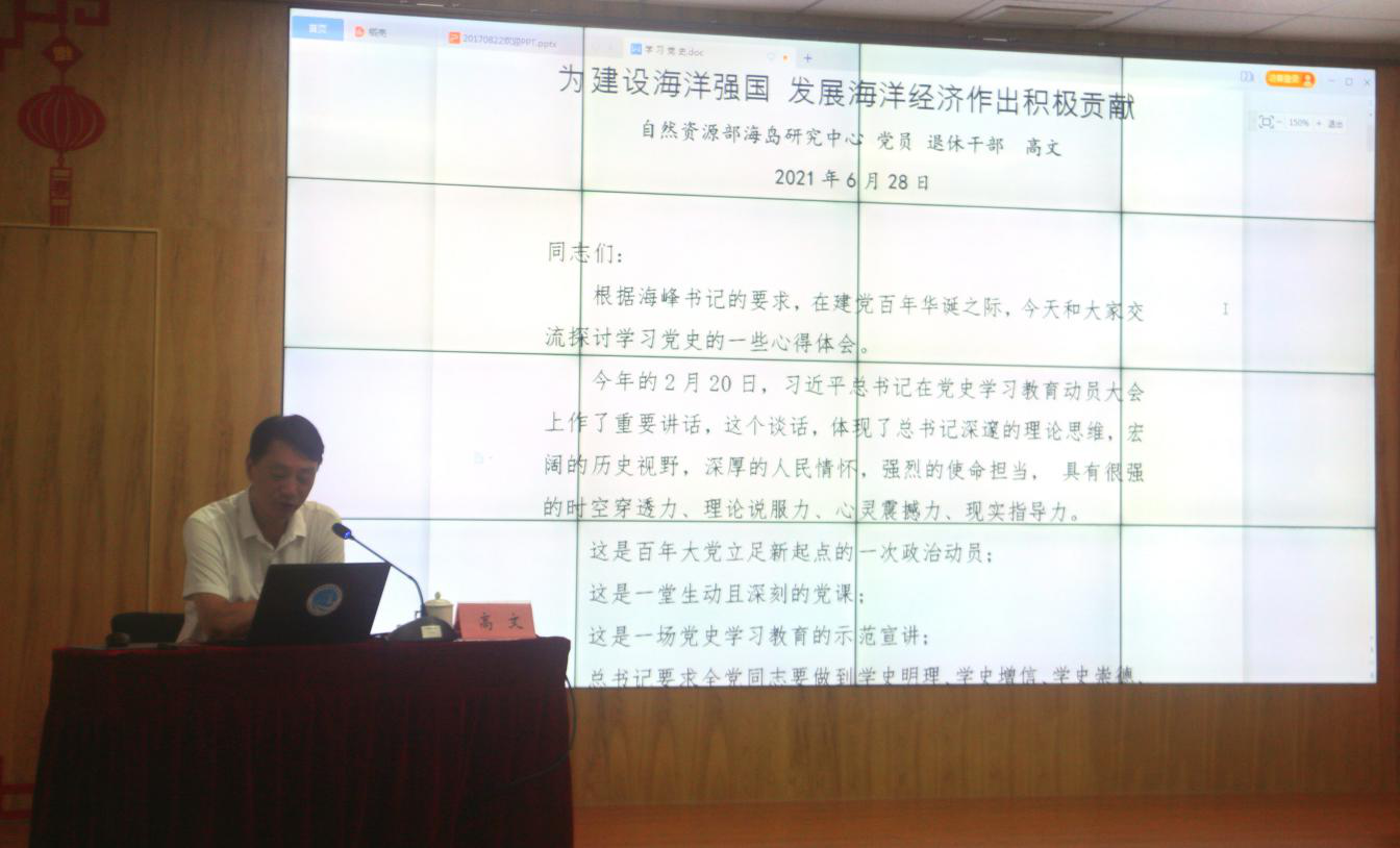在前往红色地标现场瞻仰前,中心原副主任高文同志首先为全体党员、干部讲了题为“学习党史,不忘初心、牢记使命,开拓创新,为建设海洋强国,发展海洋经济作出积极贡献”的主题党课。他主要从“百年党史的几个重要事件”、“福建省的革命历史和改革开放后的巨大成就”和“平潭岛在改革开放后所取得的成就”等三个方面做了精彩阐述,用一段段鲜活的红色故事、一个个翔实的党史事件给大家上了一堂生动的党史课。