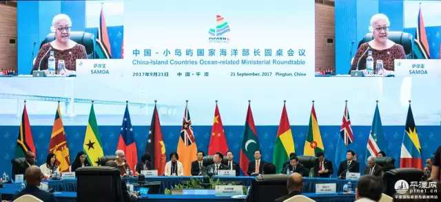 9月21日,以“蓝色经济 生态海岛”为主题的中国—小岛屿国家海洋部长圆桌会议在福建平潭召开。中共中央政治局常委、国务院副总理张高丽为此次会议召开发来贺信。国家海洋局局长王宏宣读贺信、致辞、作主旨报告,并主持会议。福建省省长于伟国致辞,萨摩亚副总理兼自然资源与环境部部长菲娅梅·内奥米·马塔阿法致辞。此次会议共有来自四大洲 12 个岛屿国家的代表参加会议。